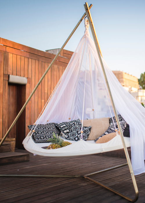 Our hanging daybeds offer a unique relaxing space, inspiring moments of tranquility, fun and togetherness, and the feeling of floating just above the ground.