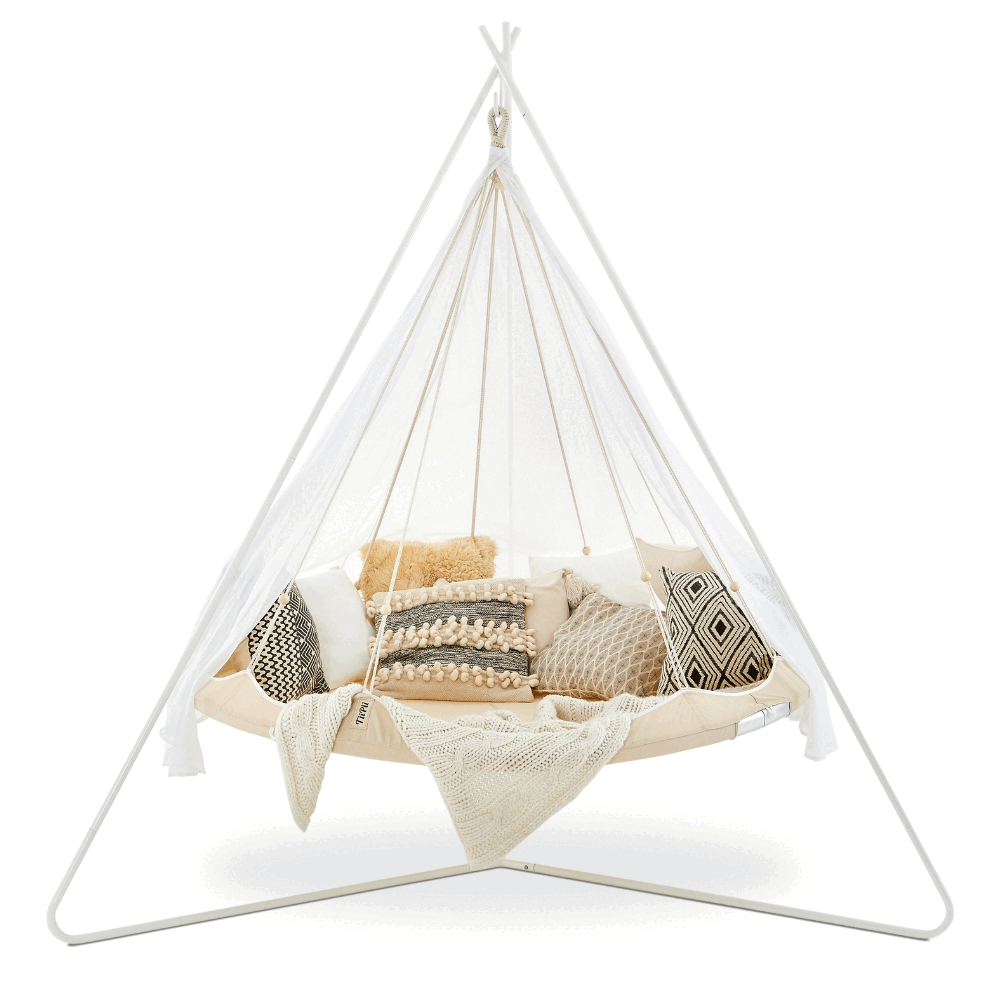 Both transportable and comfortable. Relax anywhere - hang from a branch, beam, or one of our steel teepee inspired stands.